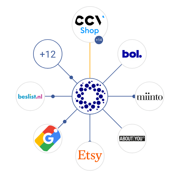 Zet je productdata in één keer goed op en verkoop naadloos via marketplaces als Bol.com, Google Shopping, Etsy, Miinto en meer — alles rechtstreeks uit je eigen systeem.